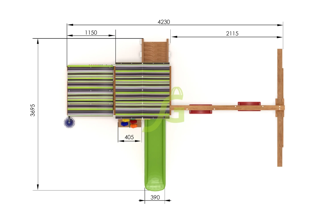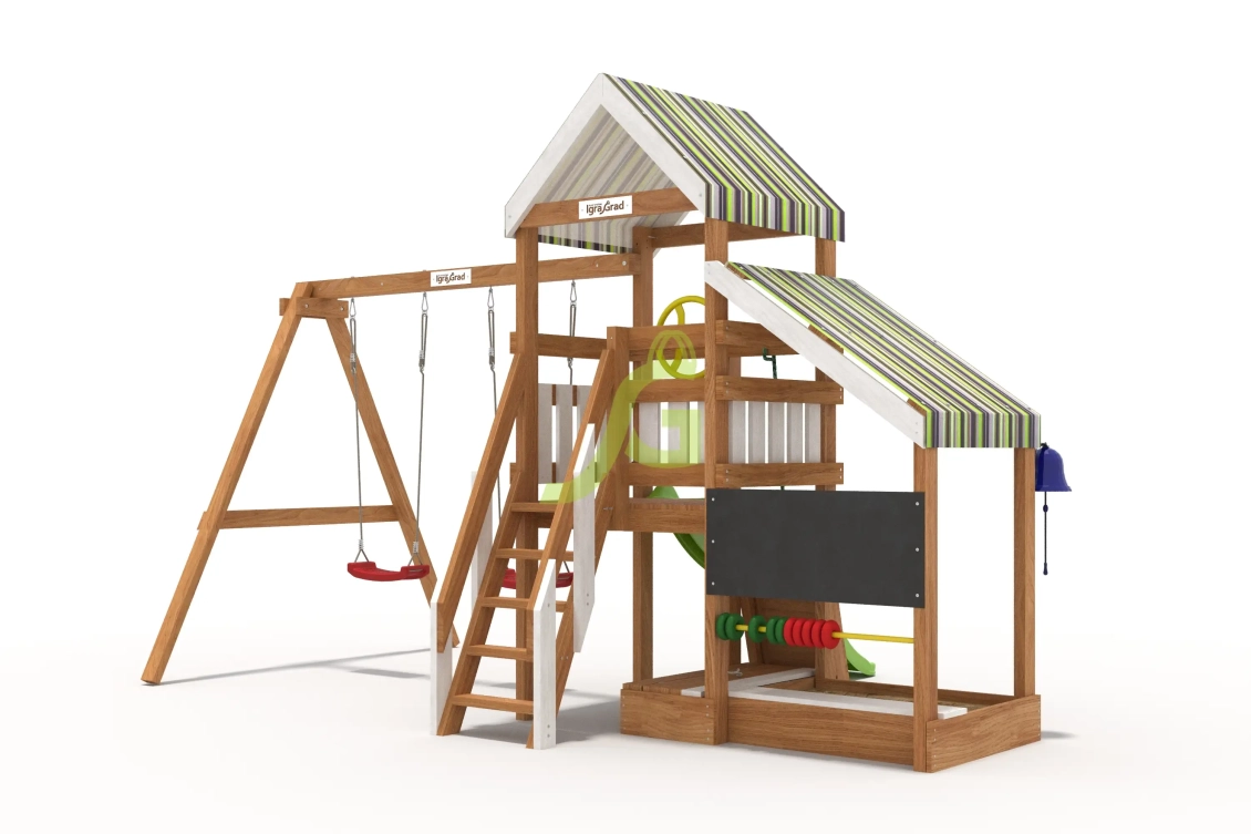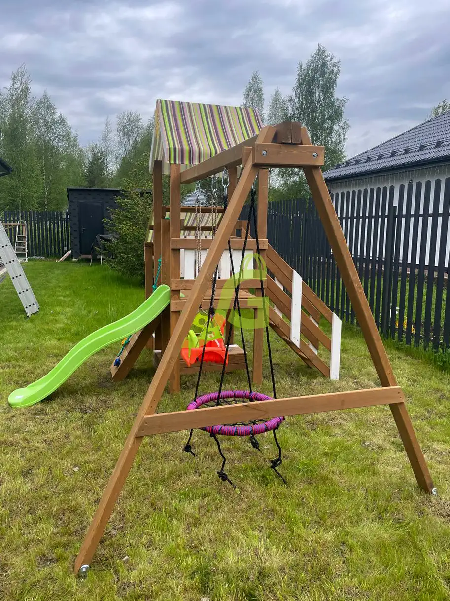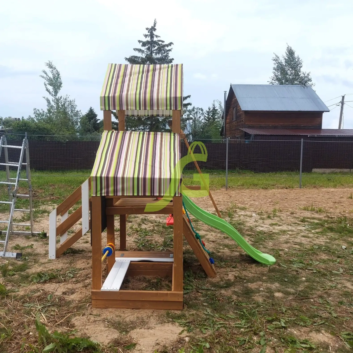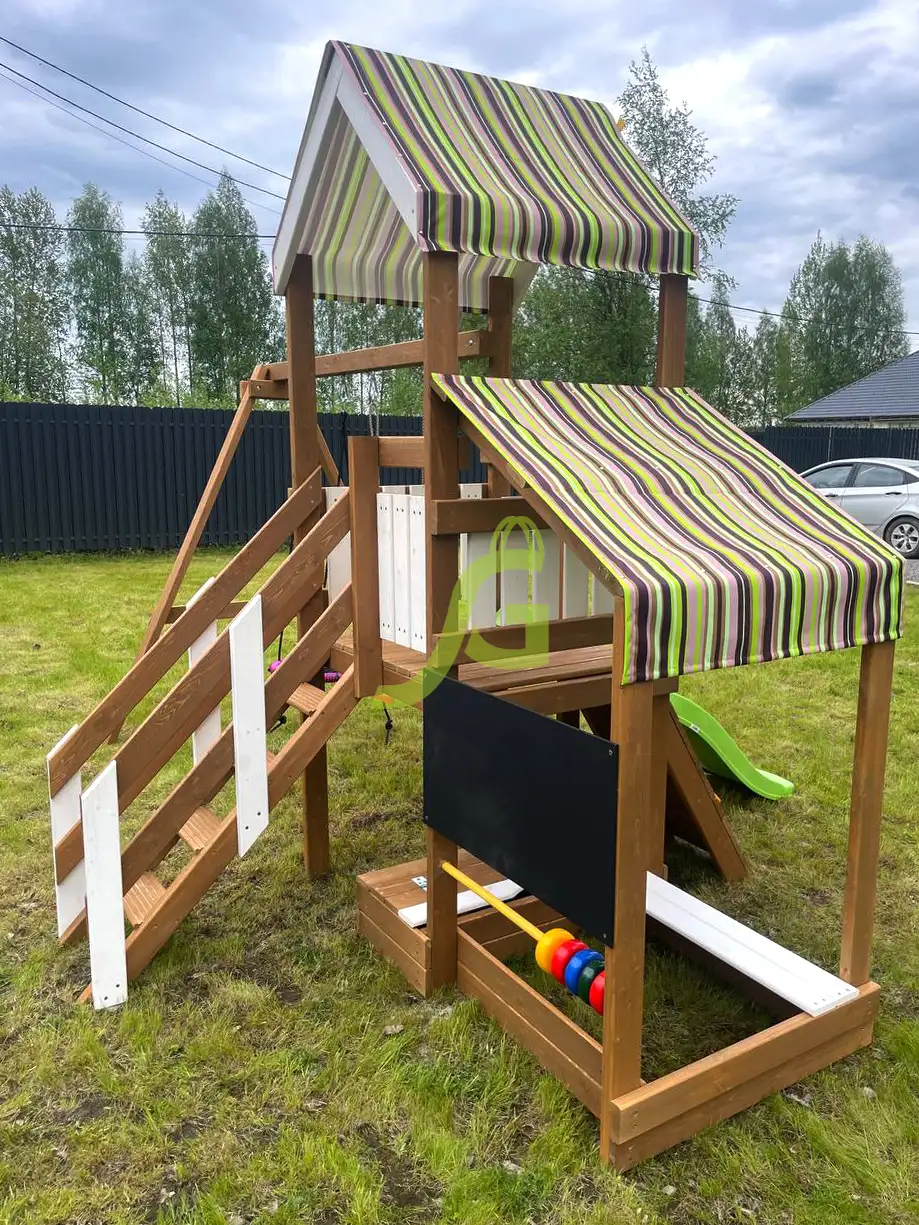 - -Безопасность и надежность: изготовлен из качественной древесины, комплекс прочный и устойчивый. Закругленные края и надежные крепления гарантируют безопасность ваших детей. Тенты защитят от солнца и легкого дождя.