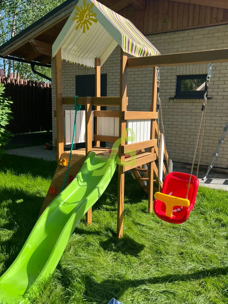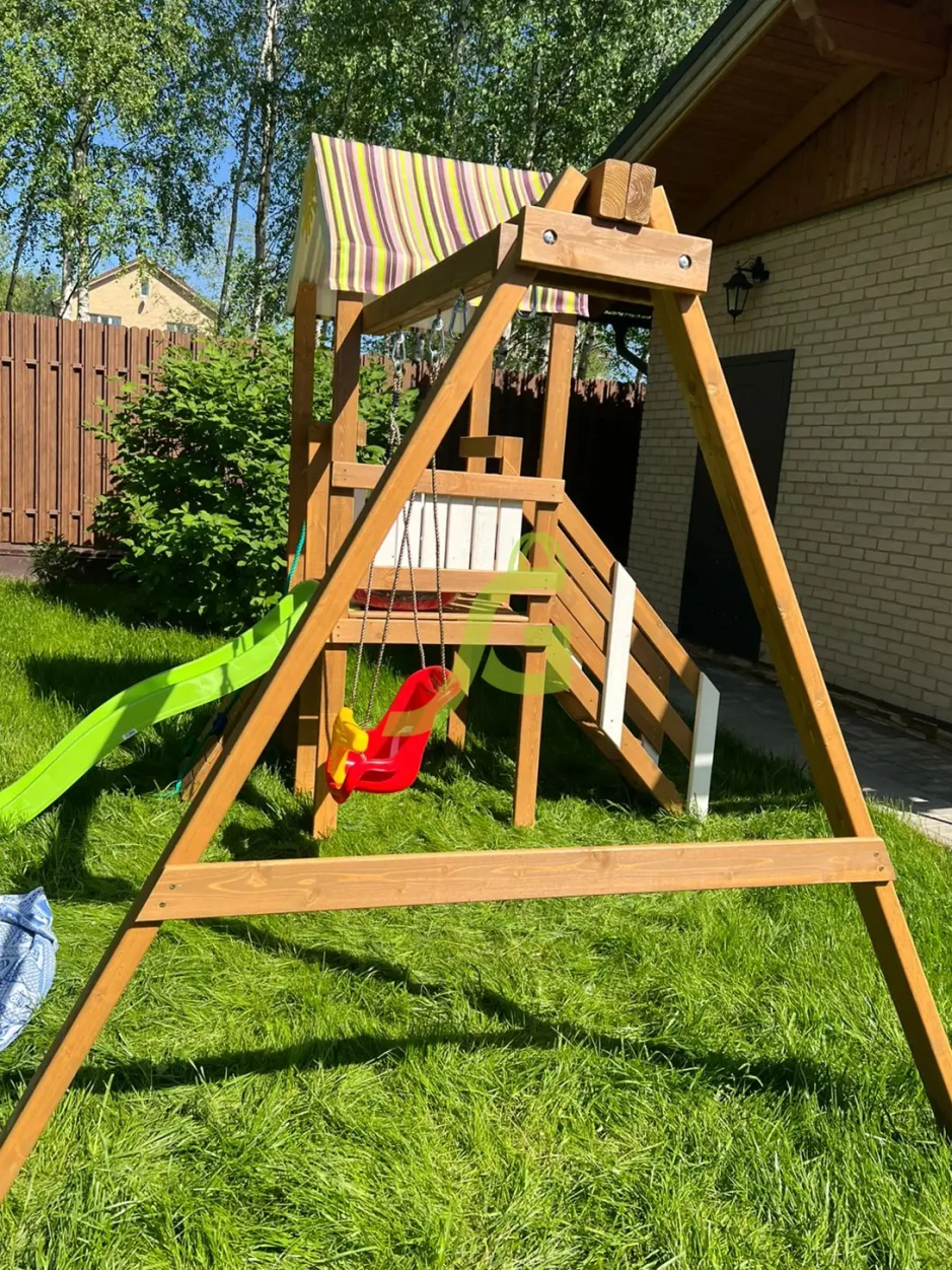 Обращаем Ваше внимание, что цвет установленной детской площадки может отличаться от представленных изображений на сайте. Специфика окраски нетоксичными пропитками допускает отклонения в цветовой гамме отгружаемых изделий вследствие различного цвета натурального природного сырья и естественных компонентов, используемых для производства площадок.