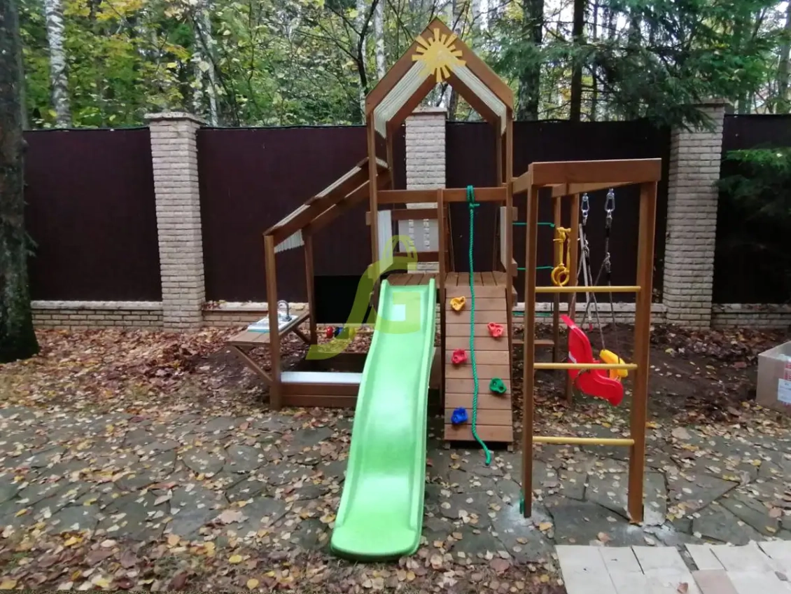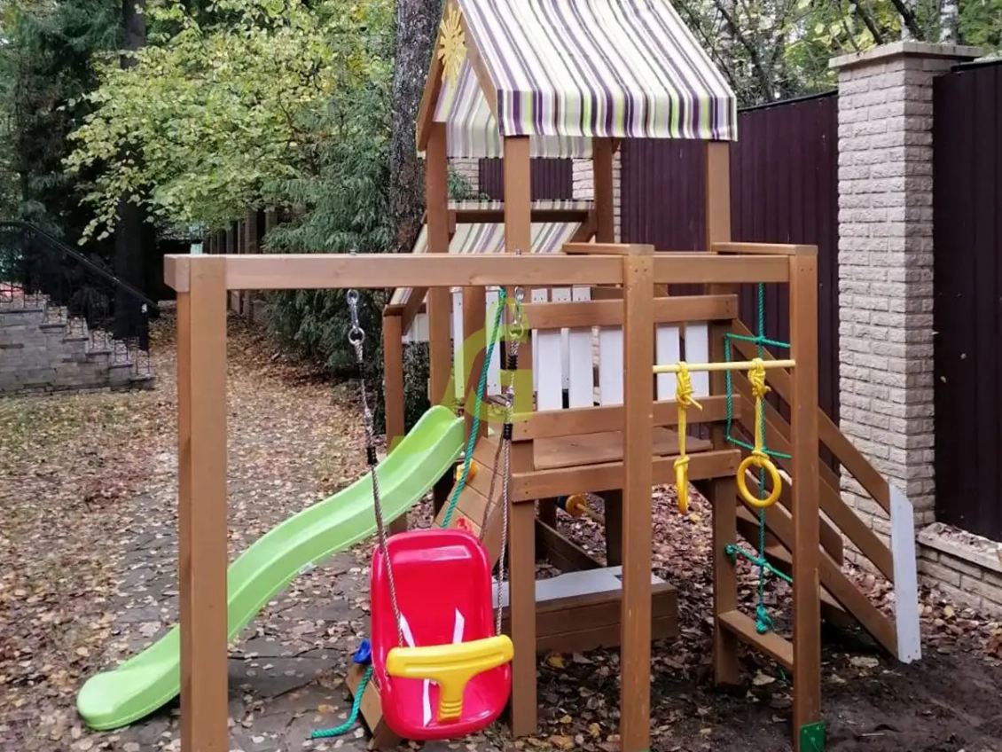 - Спортивные элементы: Турник, гимнастические кольца, веревочная лестница, стенка для скалолазания - все для активного развития и укрепления мышц.