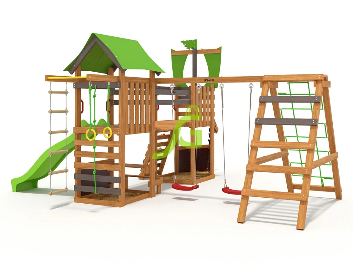 Качели и специальный модуль с лесенкой и сеткой для лазанья станут отличным дополнением к играм на свежем воздухе.