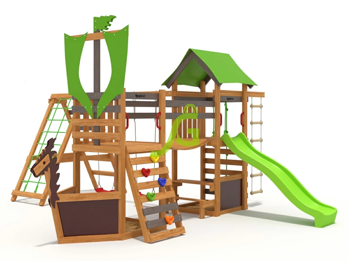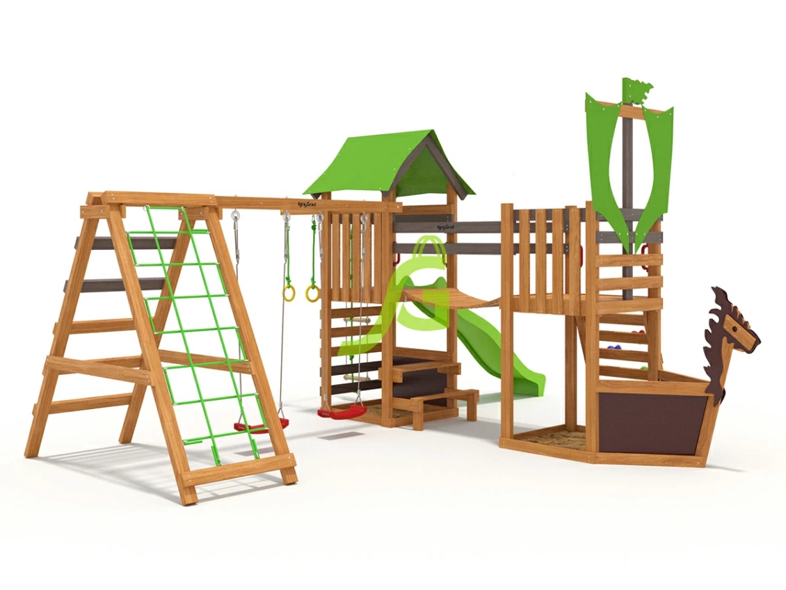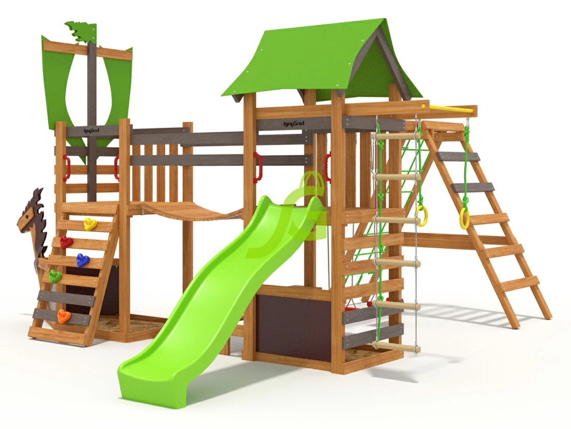 Детская игровая площадка IgraGrad W21s — это настоящая вселенная приключений для вашего ребенка, выполненная в виде корабля викингов! На первом уровне двух башен расположена песочница, причем сразу две, прилавок для быстрой продажи песочных куличиков, скамеечка и столик для рисования. Открытая для всех ветров двухэтажная башня-рубка, на нее можно взобраться по скалодрому. Подвесной мостик позволяет быстро переместиться во вторую башню с деревянной крышей, откуда так весело спускаться вниз по горке-волне.