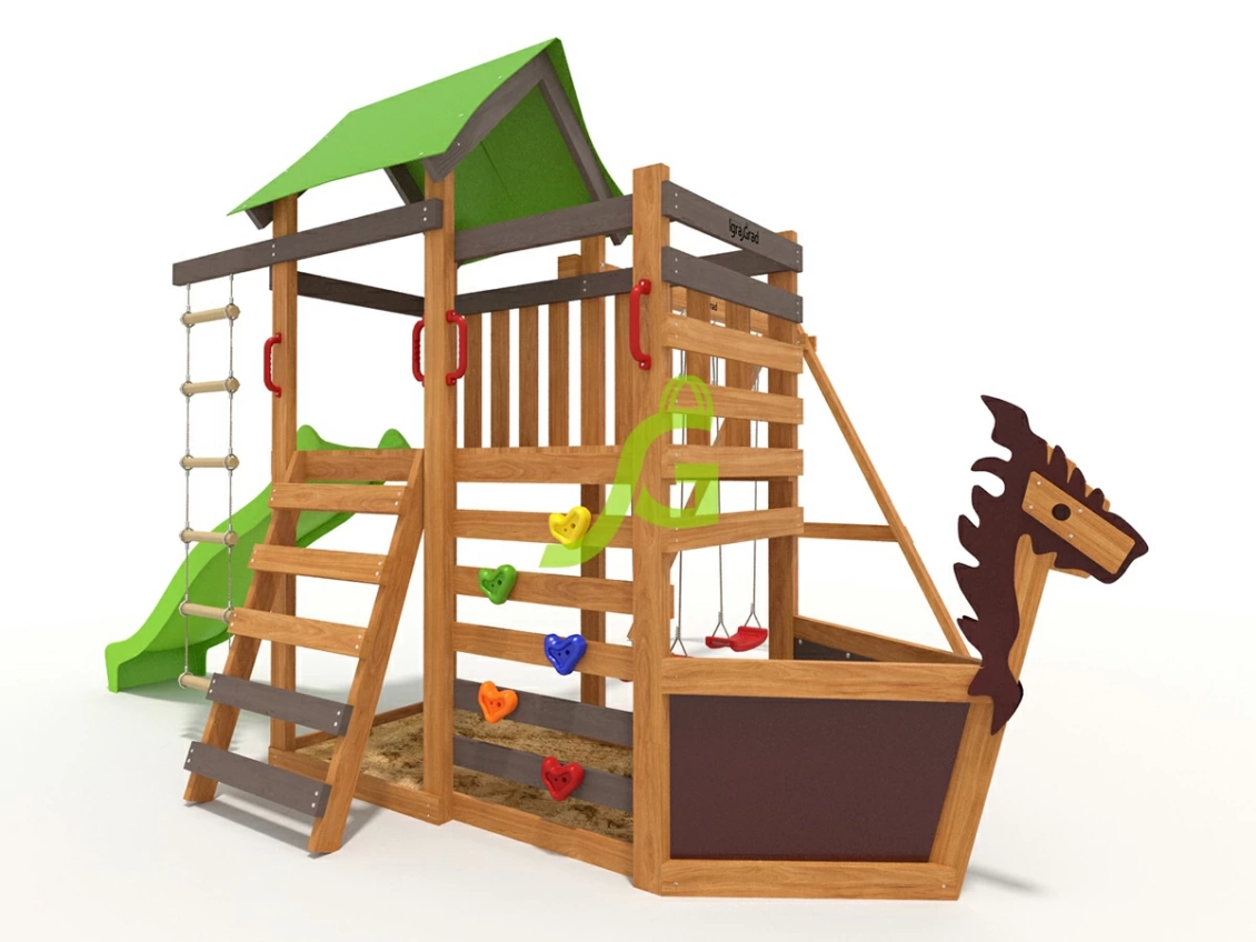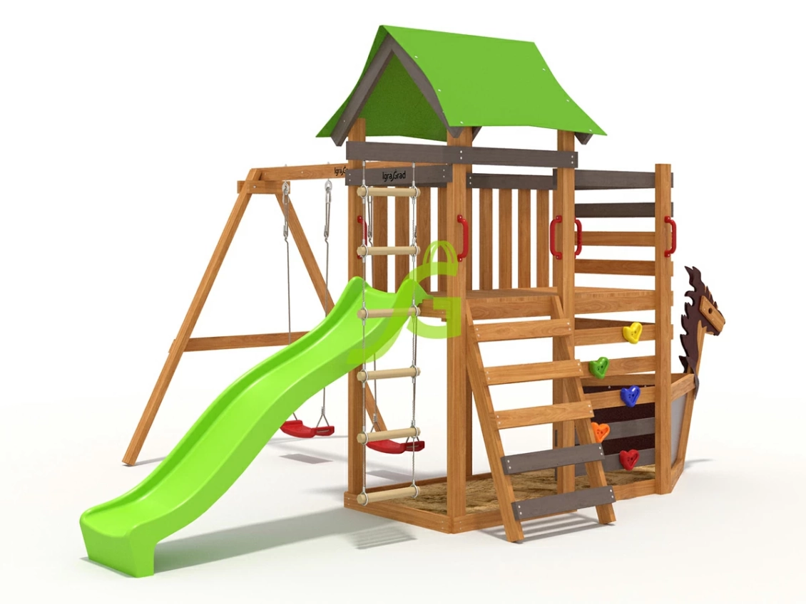 Острые края деревянных деталей — скруглены, что делает использование городка безопасным. Крыша и декоративные вставки детской площадки выполнена из влагостойкой армированной тентовой ткани ПВХ — любые негативные воздействия ей не страшны!