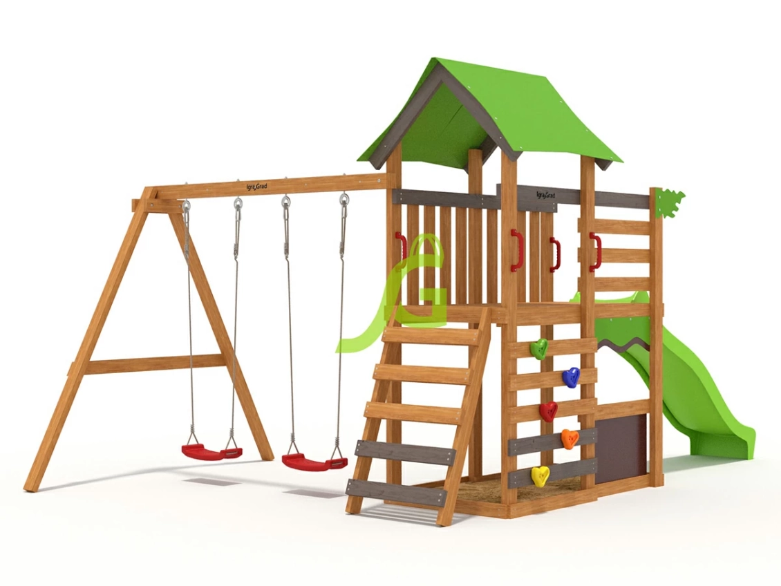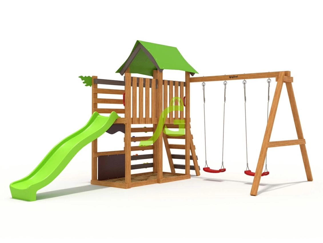 Для изготовления игрового комплекса используется древесина камерной сушки. Устойчивость и надежность конструкции обеспечивают оптимальные размеры бруса для основания — они составляют 45х90 мм. Сборку детской площадки из дерева можно осуществить самостоятельно. Для этого к ней идет пошаговая инструкция, а узловые соединения имеют все необходимые отверстия для соединения. Пластиковые аксессуары выдерживают разный температурный режим.