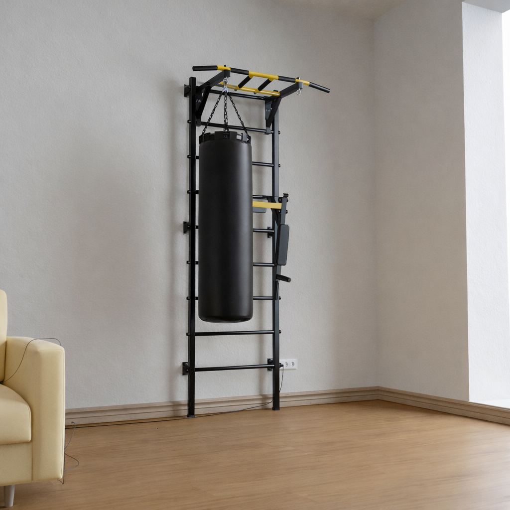 - Надежная стальная конструкция с профилем 40х40 , которая выдерживает до 250 кг. Вылет от стены 47 см - это идеальный вылет, так как в некоторых упражнениях требуется смещать корпус тела вперед, и при таком вылете Вы не будете касаться ногами шведской стенки.