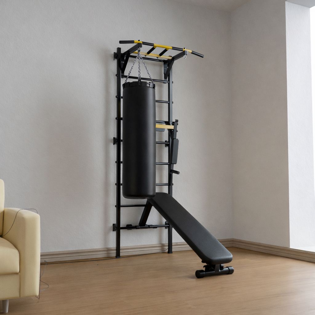 - Надежная стальная конструкция с профилем 40х40 , которая выдерживает до 250 кг. Вылет от стены 47 см - это идеальный вылет, так как в некоторых упражнениях требуется смещать корпус тела вперед, и при таком вылете Вы не будете касаться ногами шведской стенки.
