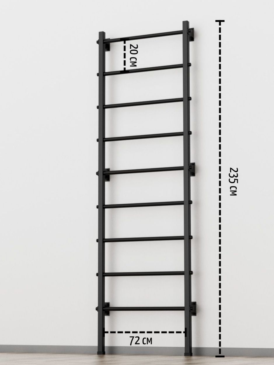 - Надежная стальная конструкция , которая выдерживает до 250 кг. Вылет от стены 47 см - это идеальный вылет, так как в некоторых упражнениях требуется смещать корпус тела вперед, и при таком вылете Вы не будете касаться ногами шведской стенки.