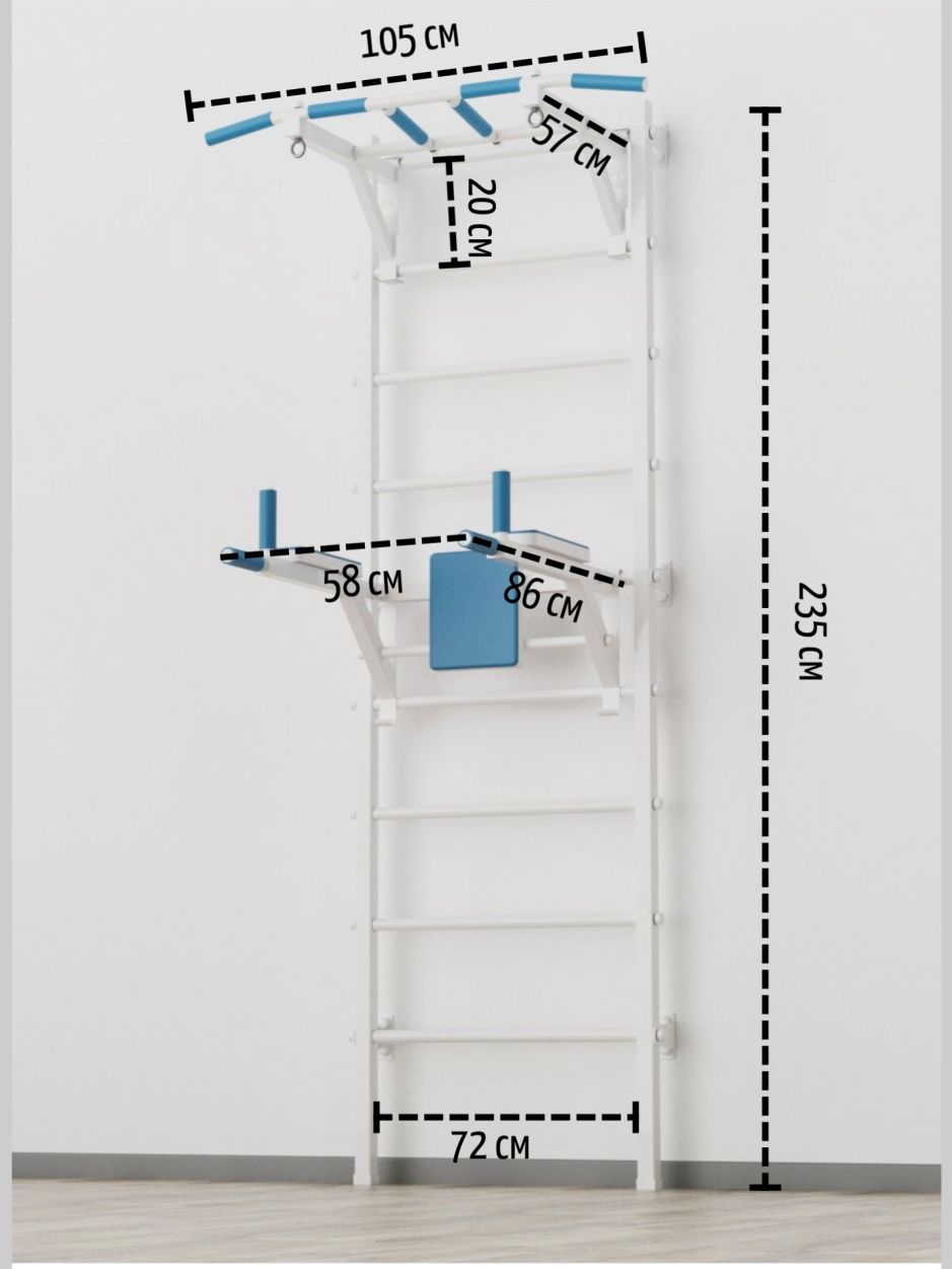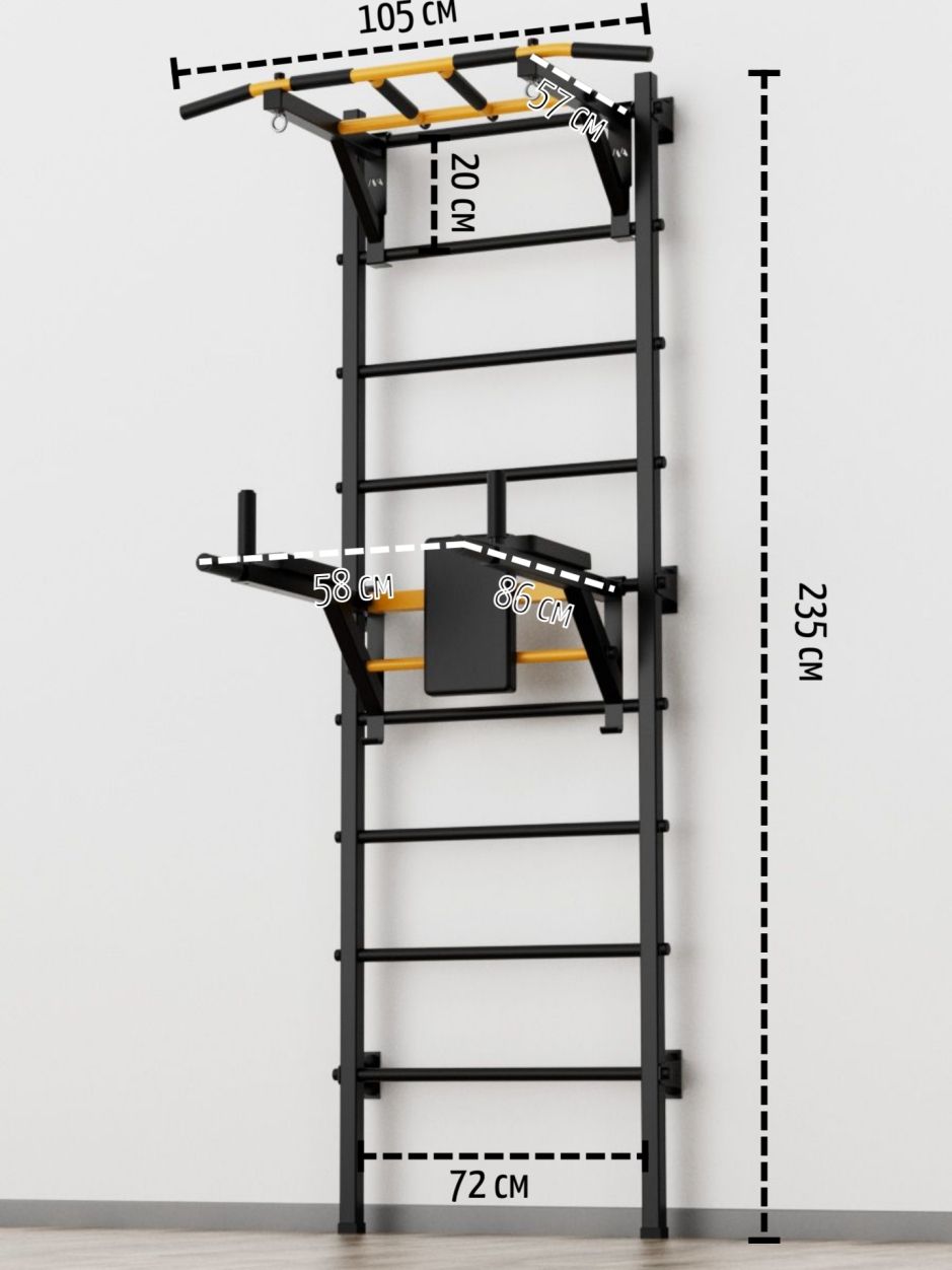 - Надежная стальная конструкция с профилем 40х40 , которая выдерживает до 250 кг. Вылет от стены 47 см - это идеальный вылет, так как в некоторых упражнениях требуется смещать корпус тела вперед, и при таком вылете Вы не будете касаться ногами шведской стенки.