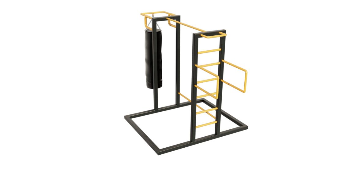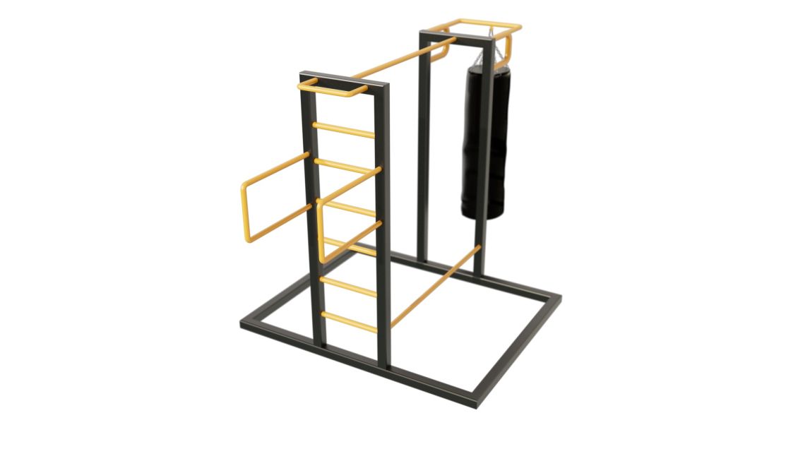 Основание разборное, состоит из 4-х частей /Боковая часть с брусьями, лестницей и малыми перекладинами / Боковая часть с подвесом для груши (боксёрская груша в комплект не входит) / Две съемных перекладины.