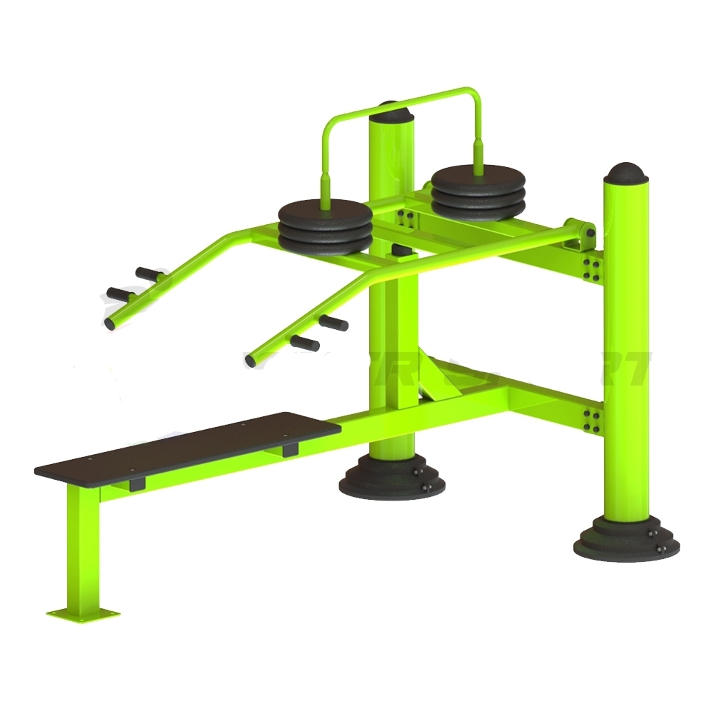 Уличный тренажёр «Жим лёжа с изменяемой нагрузкой» предназначен для стационарной установки на уличной площадке. Упражнения в тренажере имитируют жим штанги и развивают мышцы спины, груди и рук. Нагрузка в тренажере осуществляется за счет веса металлических обрезиненных дисков. Шаг нагрузки 10 кг, максимальный вес 60 кг. Два уровня хвата для людей разного роста. Подходит для пользователей разного уровня физической подготовки.